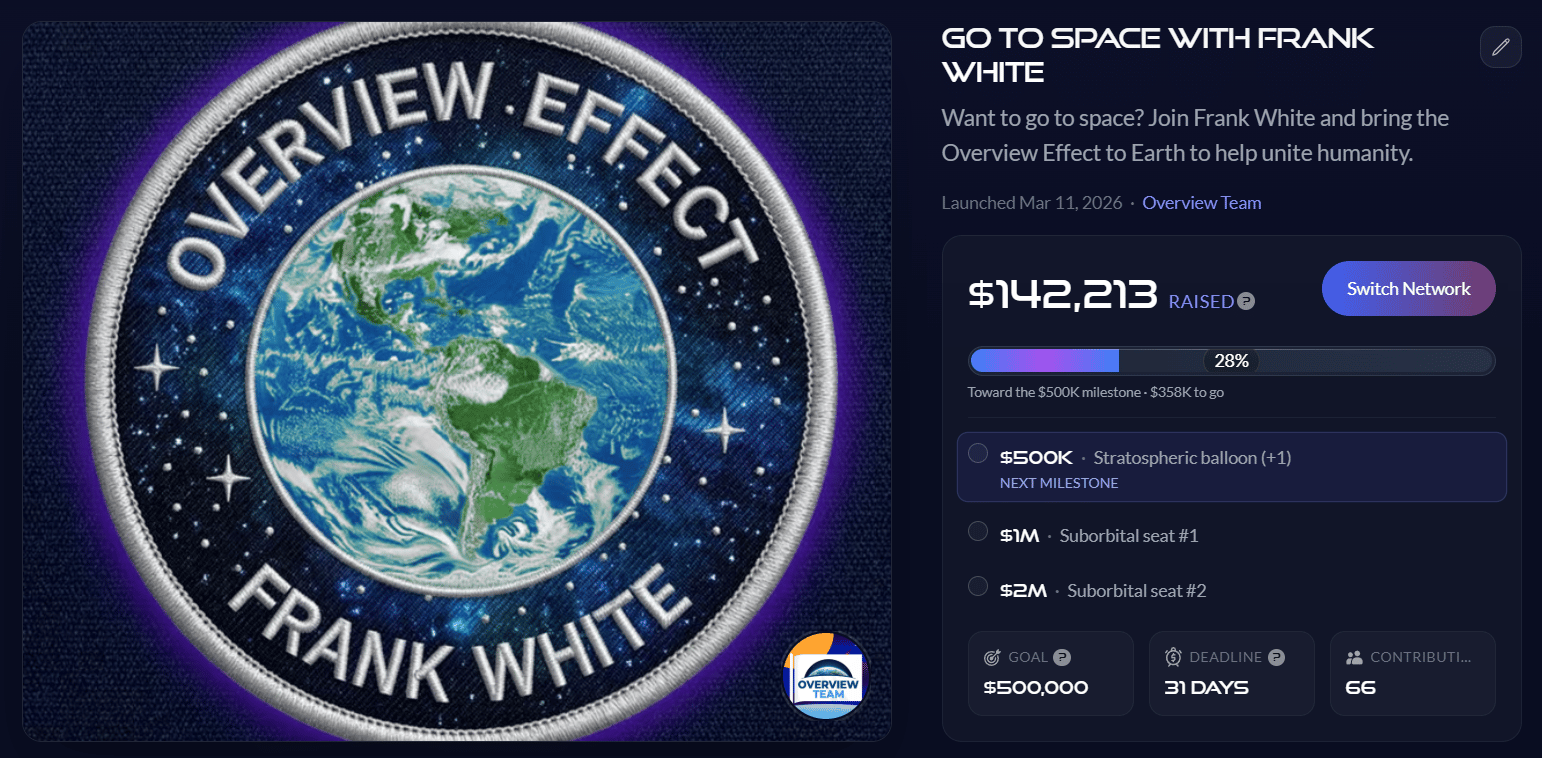We've launched our most ambitious campaign yet: sending legendary space philosopher Frank White to space. And you can join him... For forty years, Frank has documented the profound cognitive shift known as the Overview Effect, yet he has never left Earth himself. MoonDAO is now mobilizing to raise funds for a spaceflight for Frank and one chosen member of our community. This is a historic opportunity to honor his legacy, push the boundaries of decentralized space exploration, and directly...