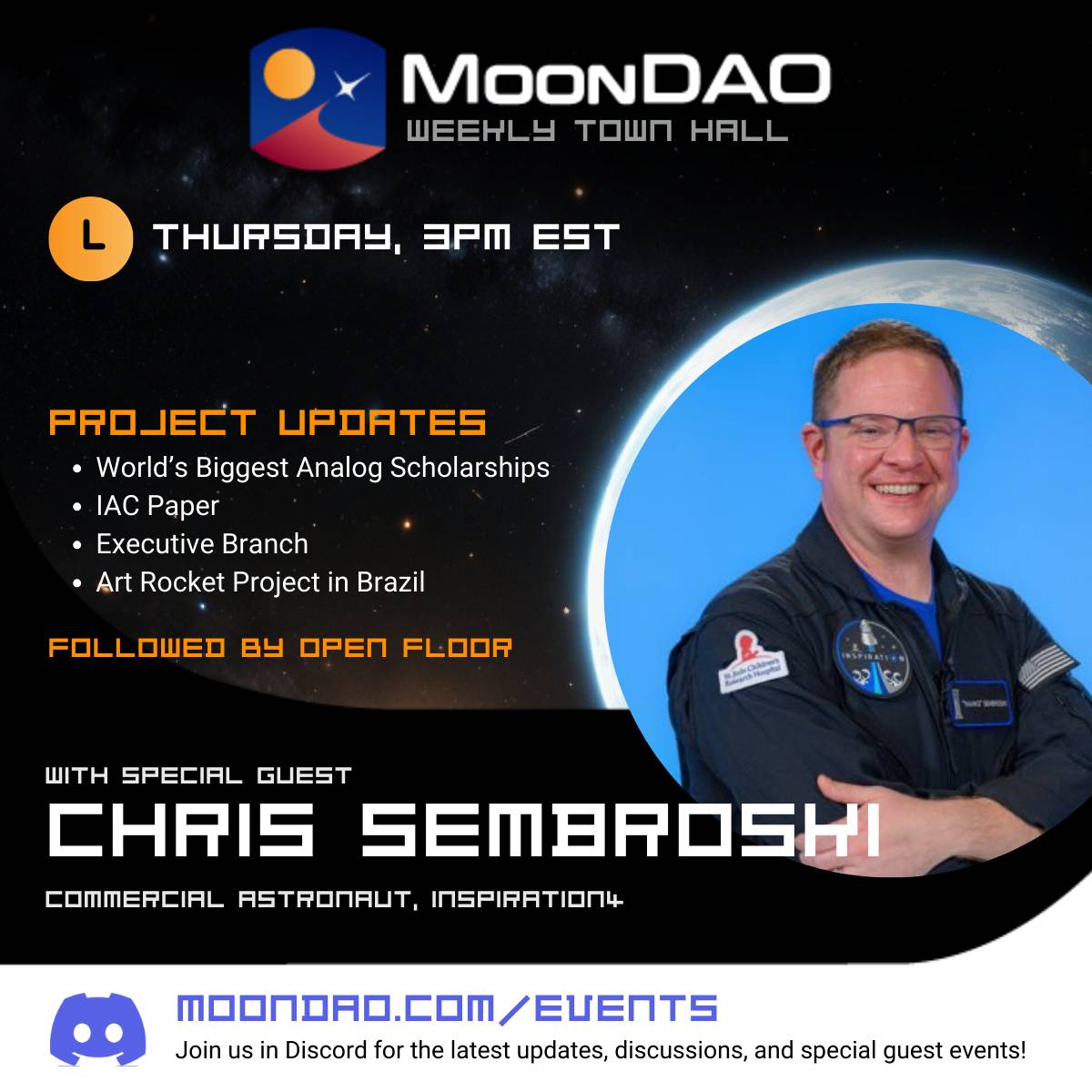 Join us tomorrow for a very special town hall with Chris "Hanks" Sembroski, commercial astronaut with the Inspiration4 mission.