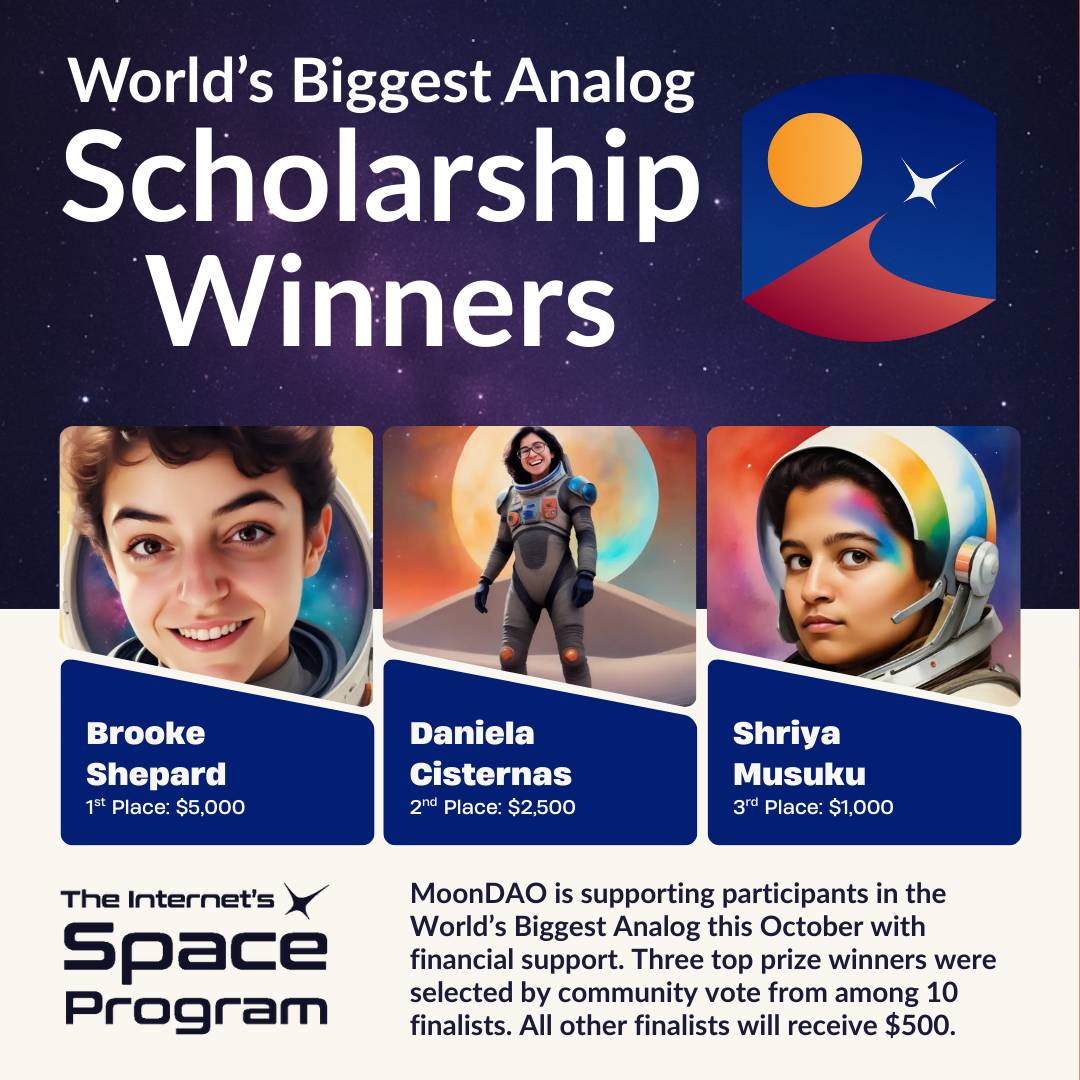 The top three, as decided by MoonDAO voters, were Brooke Shepard, Daniela Cisternas, and Shriya Musuku. All other finalists will be receiving $500 to support their participation in this one of a kind global analog mission.